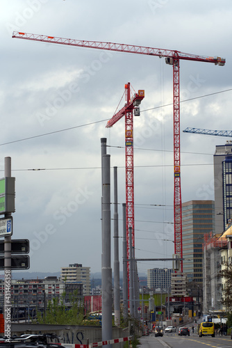 Construction site of skyscraper at City of Zurich with super high cranes. Photo taken April 29th, 2021, Zurich, Switzerland.