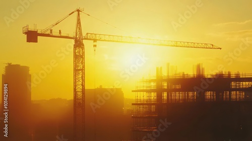 construction, crane, sunset, city landscape, silhouette, building, urban, sky, gold, light, horizon, architecture, development, progress, industry, work, machinery, site, tower, steel, beam, framework, structure, concrete, rebar, city, skyscraper, men at work, aerial, view, hours, evening, sunrise, dawn, day, night, summer, warm, colours
