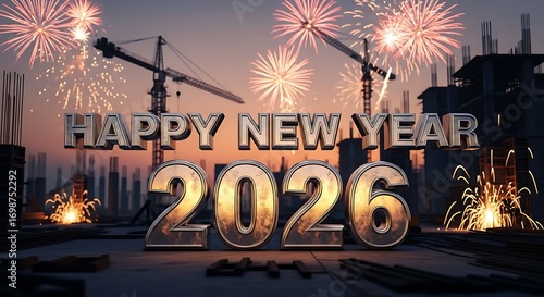 Construction site with fireworks and cranes celebrating happy new year 2026