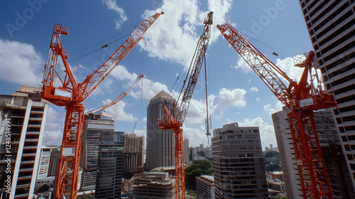 Construction skyline with tower cranes under blue sky and fluffy clouds overlooking urban cityscape with tall buildings and modern architecture