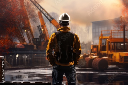 Construction worker at work in his yellow hi-vis vest, panorama, site, commercial port. Industry worker from behind with safety jacket and helmet Refinery plant looking at factory, heavy industrial