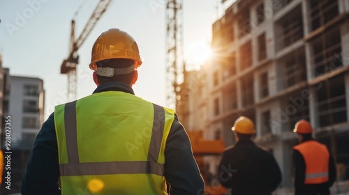 Construction worker in a yellow vest and hardhat stands with his back to the camera at a building site.