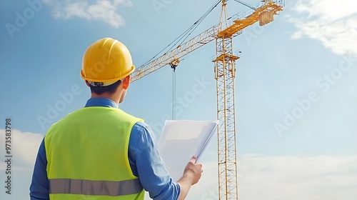 Construction worker inspecting plans at a building site under a clear blue sky, showcasing safety and engineering.