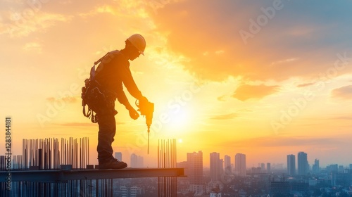 Construction worker operating power tool at sunset urban building site photography industrial environment side view labor and progress