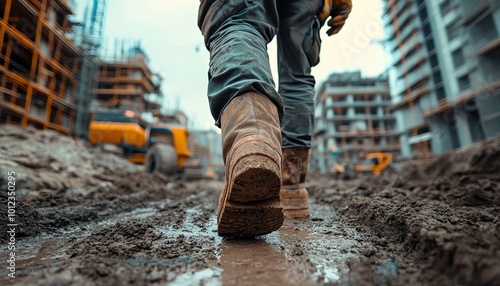 Construction worker s legs onsite, capturing the details of the work environment and construction activity