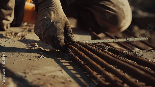 Construction worker securing steel reinforcements in a concrete slab. Strength and precision