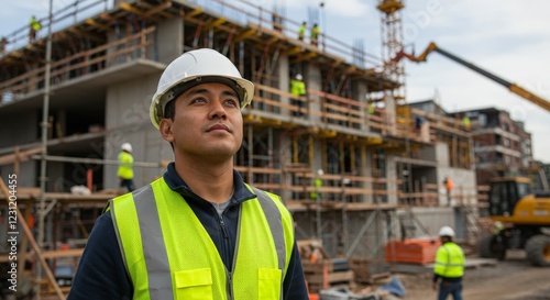 construction worker wearing a yellow high-visibility vest and a white safety helmet looking upwards.
