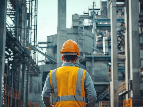 Construction Worker Wearing Hard Hat and Safety Vest Standing in Front of Industrial Building