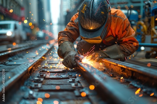 welding, construction, men at work, railway, track, city, urban, metal, spark, safety, gear, helmet, work, labor, infrastructure, transportation, train, railroad, repair, maintenance, industrial, job, profession, engineer, equipment, tool, machinery, steel, iron, torch, flying, tied-up, daytime, daylight, outdoors, city landscape, background, blurred, city landscape, light, building, modern, development, progress, growth, project, team, crew, industry, manufacturing