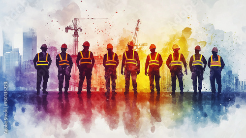 Construction workers in colorful safety gear stand together, viewed from behind, with vibrant watercolor splashes forming an abstract background, highlighting unity, diversity, and collaboration in th