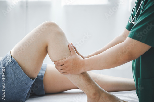 Consultation therapist with the treatment of treating injured knee of the patient with his therapist in clinic, sport physical therapy concept,