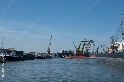 Container ships moored at a container terminal in the Port of Rotterdam. The port is the Europ's largest and facilitate the needs of a hinterland