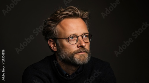 Contemplative Bearded Man with Glasses in Thoughtful Pose Against Dark Background