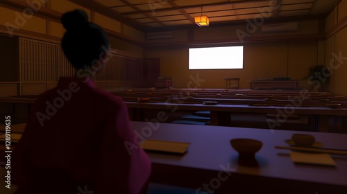 interior, dining, traditional, japanese, eatery, empty, serene, contemplative, evening, warm, ambience, wooden, table, minimalist, lighting, cultural, quiet, atmosphere, person, viewpoint