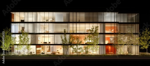 Contemporary Apartment Building Facade Illuminated at Night Offering Glimpses into Modern Urban Living