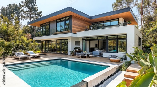 Contemporary Architectural Marvel Featuring a Sleek Modern House Surrounded by Lush Greenery with an Inviting Pool and Spacious Patio for Ultimate Relaxation and Outdoor Enjoyment