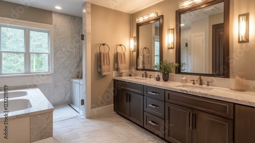 bathroom, sink, bathtub, luxury, decor, shower, upscale, mirror, faucet, marble, design, vanity, contemporary, clean, modern, cabinet, roomy, organised, elegant, towel, polished, residence, area, serene, style, neat, cosy, minimal, ceramic, double, counter, glasses, natural, interior, home, fresh, window, classic, calm, light, relaxing, bright, indoor, simple, potted, plant, hardware, fixture