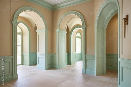 Contemporary Beige and Pastel Green Wallpaper Featuring Arched Doorways for Serene Spacious Interiors