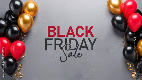 Contemporary Black Friday Sale Image with Stylish Black Red and Gold Balloons and Gift Boxes Wrapped in Black White and Red with Gold Bows