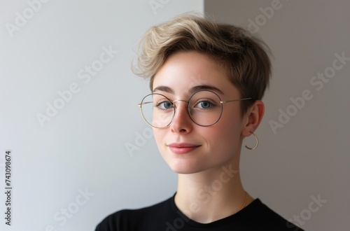 young, woman, short, blond, hair, round, eyeglass, hoop, earring, black, top, neutral, background, simple, casual attire, fashion, modern, female, face, minimalistic, style, clean, look, light, natural, expression, person, individual, calm, apparel, accessory, vision, contemporary, elegance