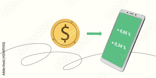 Contemporary Halftone Collage smartphone for investments concept, marketing, trading. Online Stock banner with finance elements, coins, money. Vertical invest or business poster. Vector illustration.
