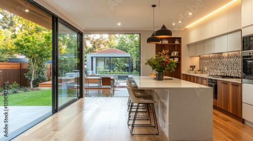 Contemporary home kitchen with an island and backyard-facing glass doors