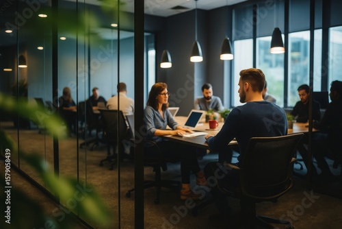 office, meeting, conference room, business, people, team, collaboration, modern, design, laptop, technology, corporate, discussion, professional, workplace, teamwork, interior, lighting, pendant, window, diversity, employee, workspace, table, chair, conference, brainstorming, strategy, planning, innovative, focused, communication, casual attire, contemporary, productive, partnership, leadership, growth, solution, innovation, global, management, expertise, idea