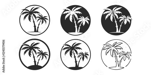 Contemporary palm tree icon set features single color illustrations of palm trees suitable for cutting, tattoo designs, or as modern palm art design elements vector