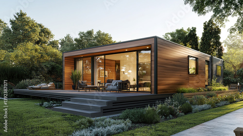 contemporary, prefab, modular, home, minimalist, design, garden, lush, architecture, modern, exterior, wood, glasses, window, deck, seating, landscape, greenery, tree, sunlight, residential, stylish, environmentally friendly, sustainable, nature, environment, peaceful, serene, relaxation