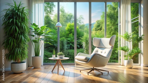 Contemporary sleek living space filled with abundant natural light, accentuated by stylish white chair and flourishing lush greenery.