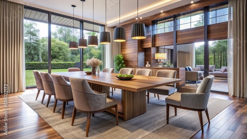 contemporary, dining, area, stylish, sleek, wooden, table, chair, stunning, pendant, lighting, roomy, setting, modern, interior, design, decoration, furniture, chair, wood, decor, luxurious, elegant, sophisticated, refined, upscale, chic, fashionable, trendy, posh, lavish, opulent, extravagant, architectural, space, ambience, atmosphere, decorative, fixture, furnishing, accessory, modernity, luxury, high-end