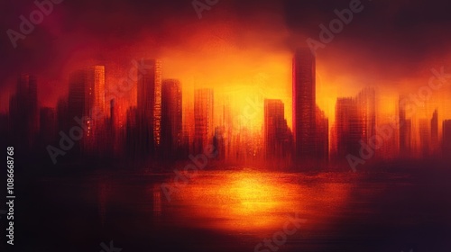 Contemporary urban skyline bathed in warm sunset light with dramatic reflections on the water and a vibrant blend of colors.
