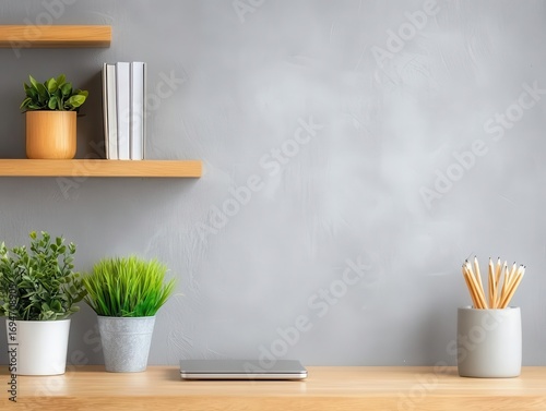 Contemporary workspace with wood accents, minimalist shelving, and calm colors