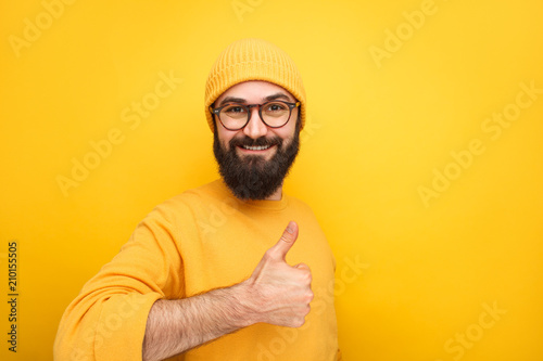 man, hipster, thumb up, cool, success, expression, yellow, approval, gesture, showing, successful, bright, guy, photogenic, lifestyle, style, emotional, up, signs, cheerful, confident, symbol, trendy, beard, male, colours, colourful, high-coloured, playful, agreements, happiness, vibrant, casual attire, goggles, confidence, content, stylish, achievement, positive, modern, smart, laughing, yellow background
