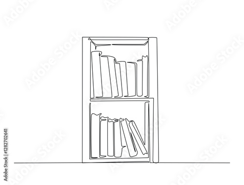 Continuous line art drawing of bookshelf furniture illustration. Shelves and books in one line drawing vector illustration. Editable stroke.