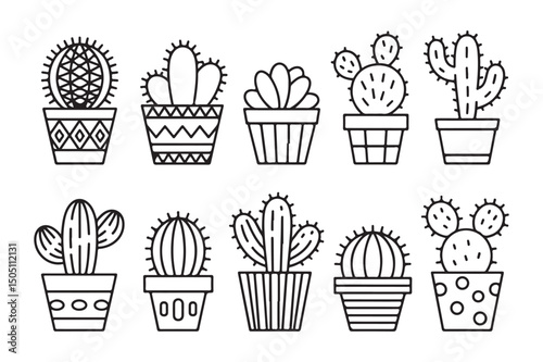 Continuous Line Drawing of Vector Set of Cute Cactus Black and White Sketch House Plants Isolated on White Background. Potted Cactus Family Line Hand Drawn Illustration