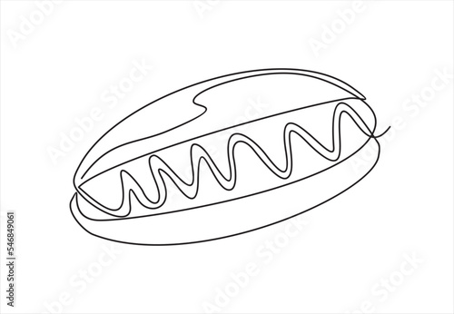 Continuous Single one line drawing of Hot dog with ketchup and mustard. Continuous line draw design graphic vector illustration.