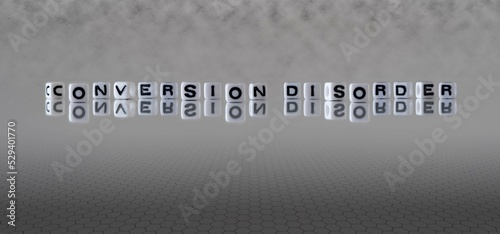 conversion disorder word or concept represented by black and white letter cubes on a grey horizon background stretching to infinity