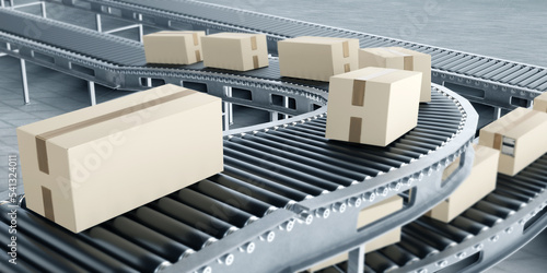 Conveyor with cardboard boxes. Concept packaging goods for factory . Production process without people. Production line for product packaging. Conveyor in factory building. Conveyor plant. 3d image