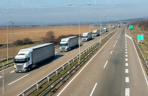 Convoy of many White transportation trucks in line as a caravan or convoy on a countryside highway under a blue sky