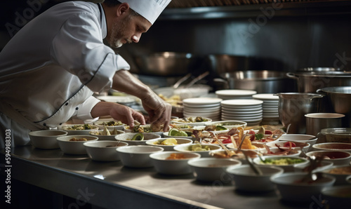 Cook preparing food in kitchen. Generative AI illustration