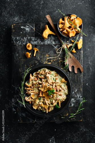 Cooked chanterelle mushrooms in a cream sauce, in a pan on the kitchen table. Top view. Free space for text.