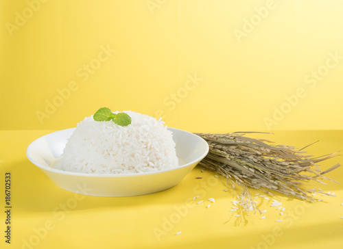 Cooked rice on plate with paddy, rice plant , thai jasmine rice