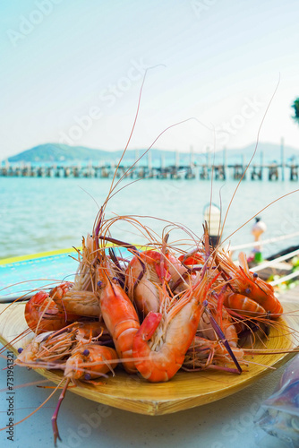 Cooked Shrimp Seafood, Fresh and delicious steamed shrimp ready to eat. Shrimp steamed at sea beach, Chonburi, Thailand.