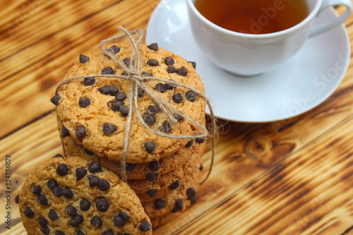 tea, stack, cup, cookie, breakfast, background, baked, bakery, brown, bow, chips, chocolate, closeup, cooking, delicious, dessert, drink, eat, food, fresh, freshness, group, bunch, homemade, ingredient, morning, pastry, rope, saucer, light meal, sweet, table, white, wood, tower, thread, knot