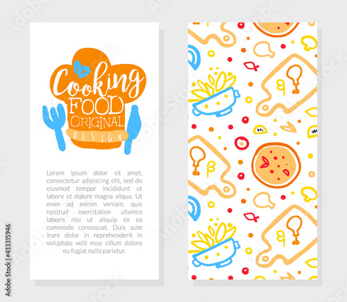 Cooking Food Card Template with Text, Culinary School, Class, Blog Flyer, Card, Brochure with Kitchenware Utensils and Cooking Ingredients Seamless Pattern Vector Illustration