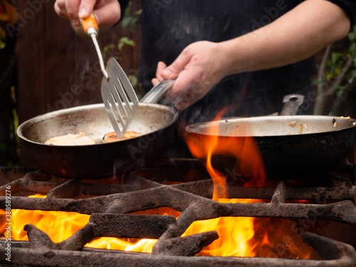 cooking on the grill in a frying pan. frying pan on fire. a man stirs food in a frying pan