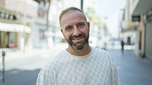 Cool, confident young man standing on street, smiling with joy - a glimpse of urban lifestyle, handsome caucasian adult embodying confidence, happiness and positivity, enjoying his city life.