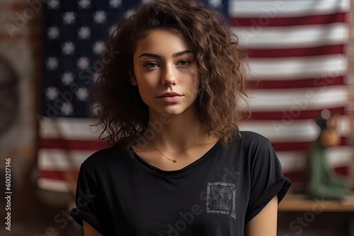 cool curly woman wearing blank bella canvas black empty tshirt, showing for mockup area, hyperrealistic, boho style, american flag is on the background behind the woman,generative ai.