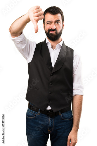 adult, attractive, bad, beard, brunette, caucasian, concept, cool, deception, disagree, dislike, down, expression, bankruptcy, fashion, finger, gesticulate, guy, photogenic, hispanic, isolated, latin, male, man, model, natural, negative, no, people, person, portrait, signs, slim, studio, style, vest, waistcoat, well-dressed, white, young